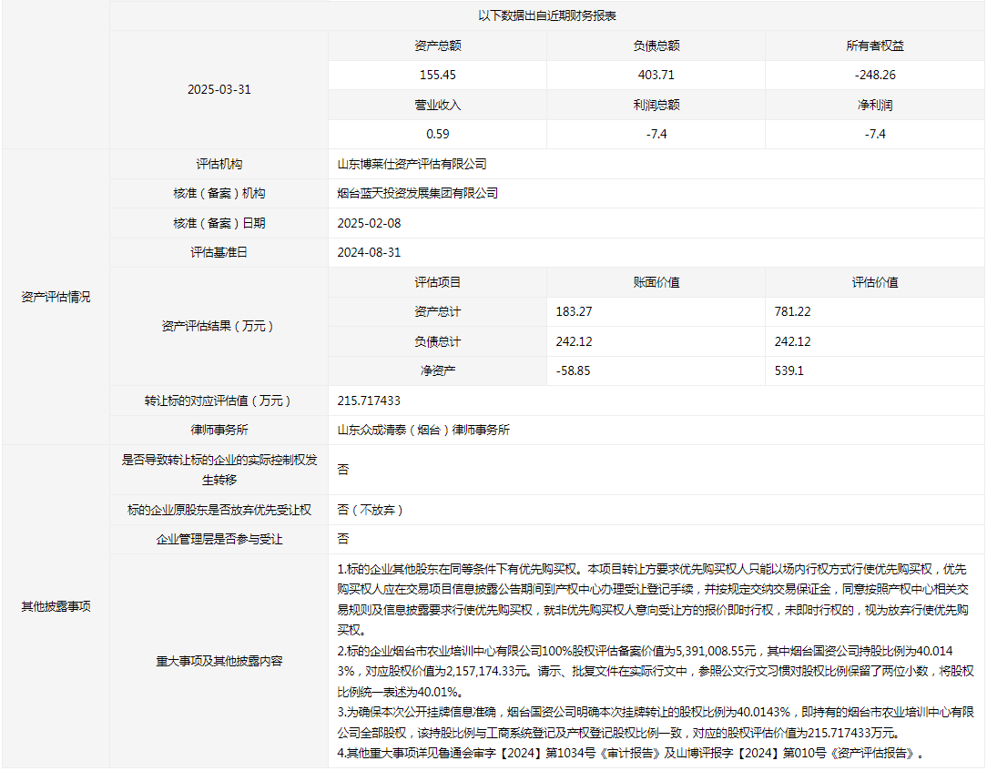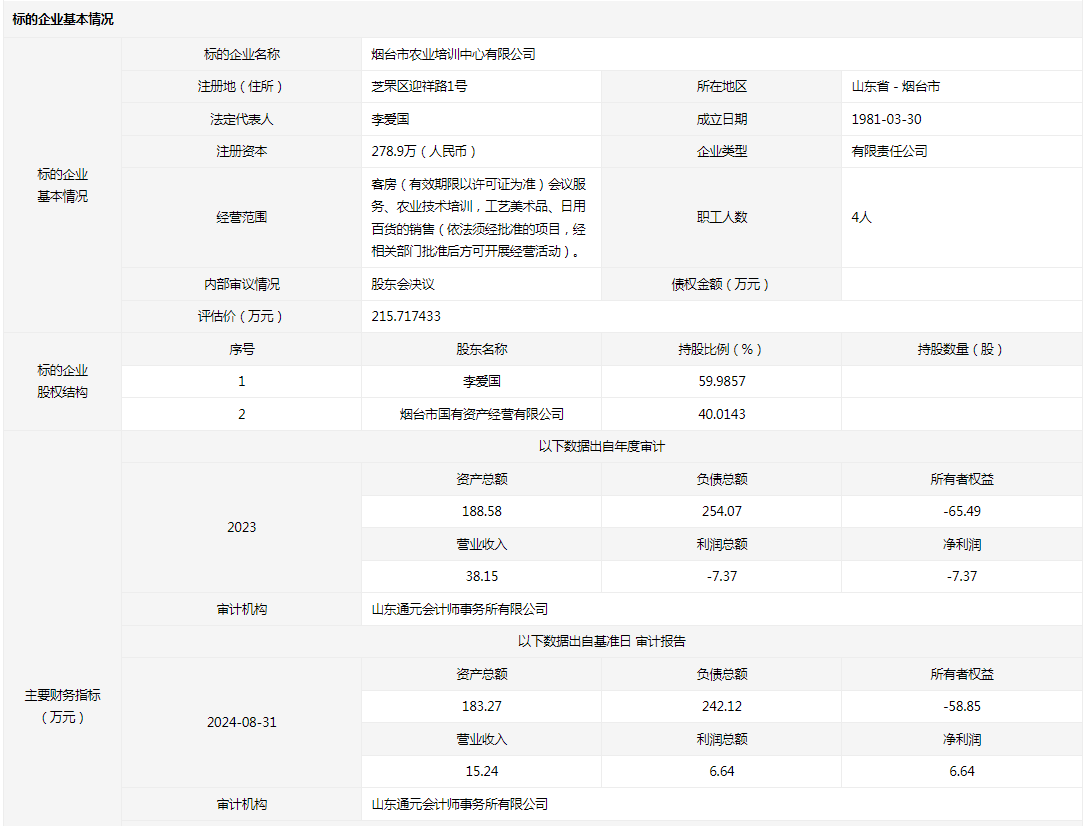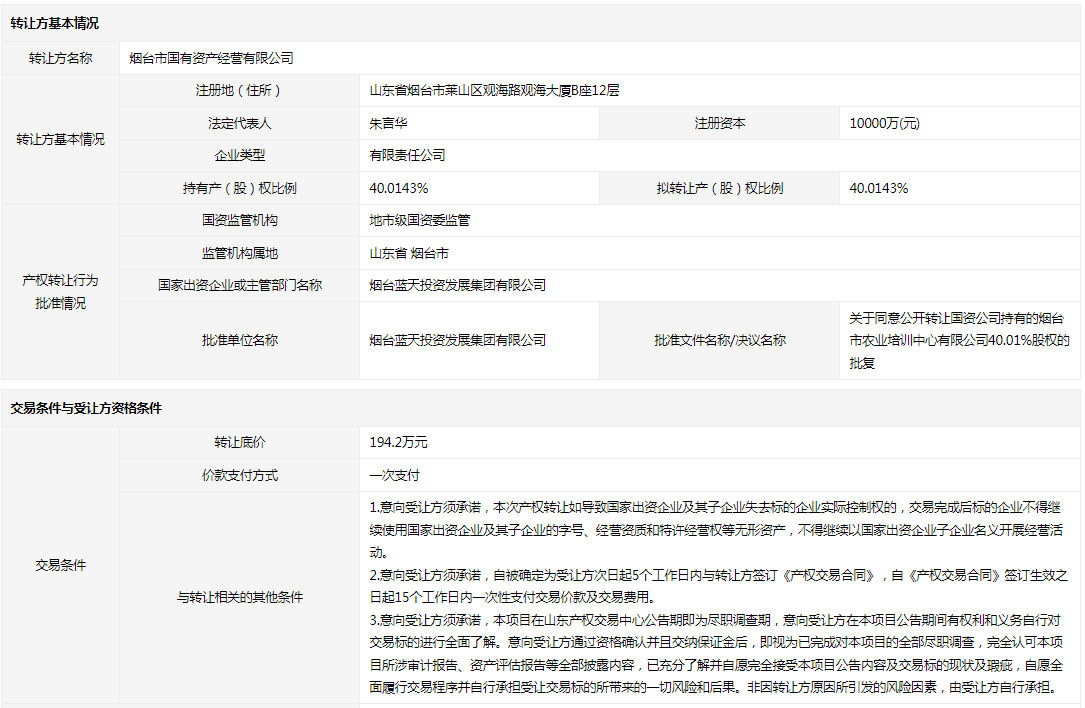 煙臺市農(nóng)業(yè)培訓(xùn)中心有限公司40.0143%國有股權(quán)