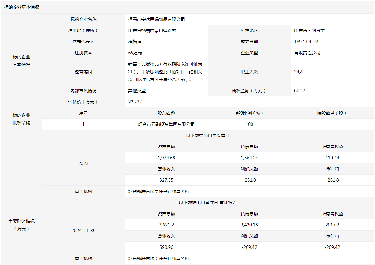 棲霞市安達(dá)民爆物品有限公司100%國有股權(quán)及債權(quán)